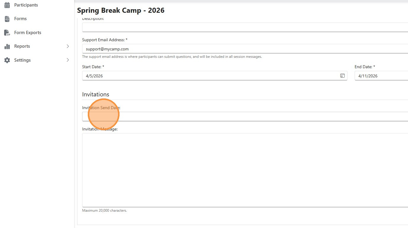 After the session is created, additional settings can be configured, including a Session description, the date invitations are sent to participants, and a custom invitation message. This message is included in the email sent to participants.