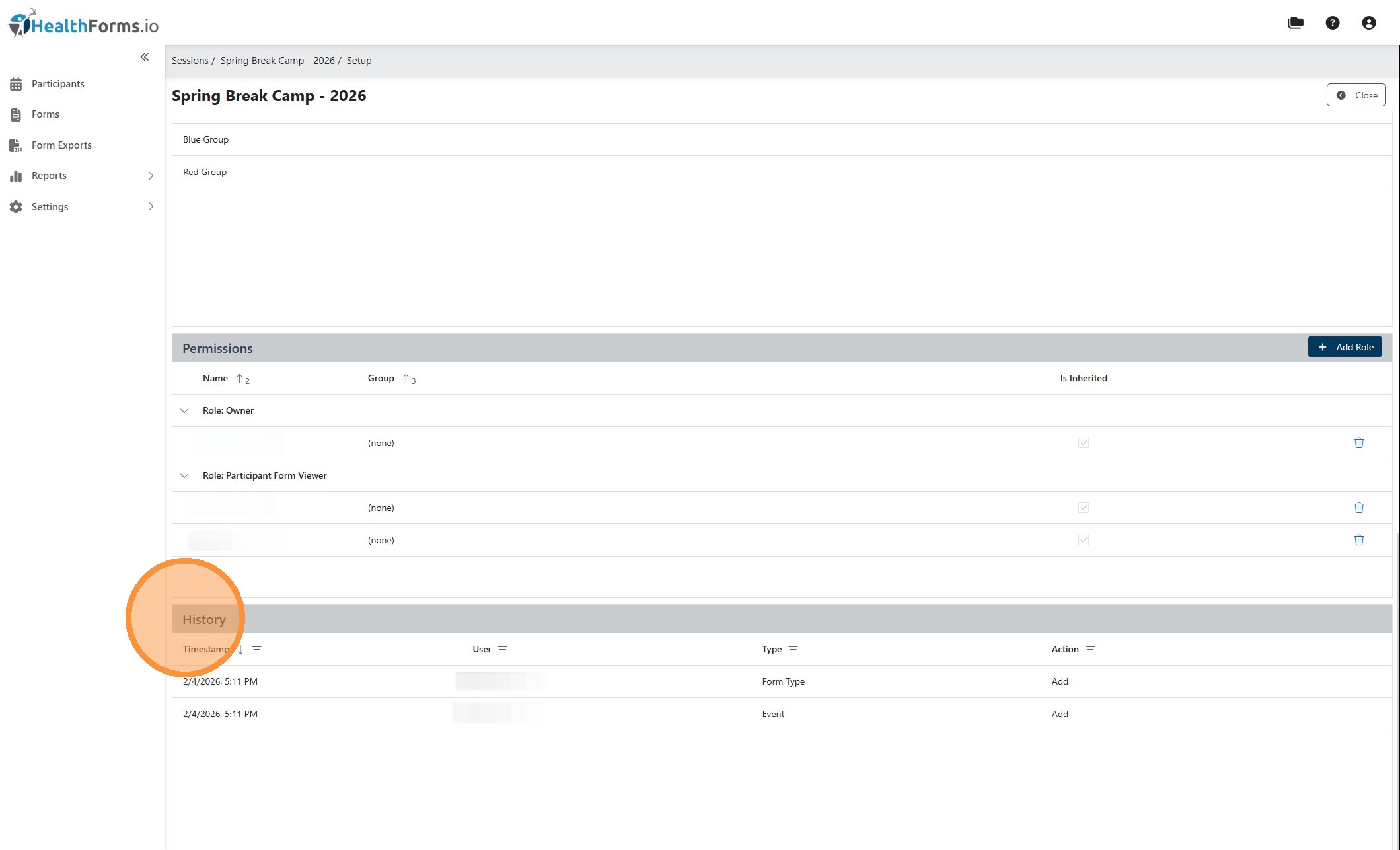 The History section maintains an audit log of all changes made to the session, including details of the change and the user who performed the action.